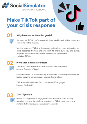 At the Social Simulator, vertical video and TikTok-style content is already an important part of our training content. As users of TikTok, we're also noticing the number of potential crises brewing on the channel. We want to make sure you are aware, prepared and confident to handle any crisis on any channel, including TikTok.